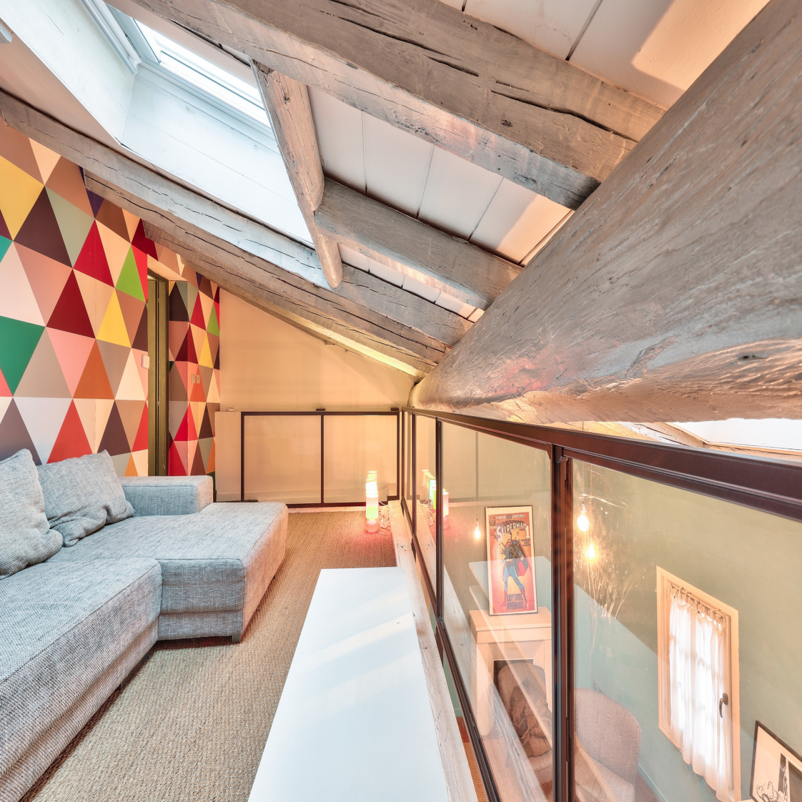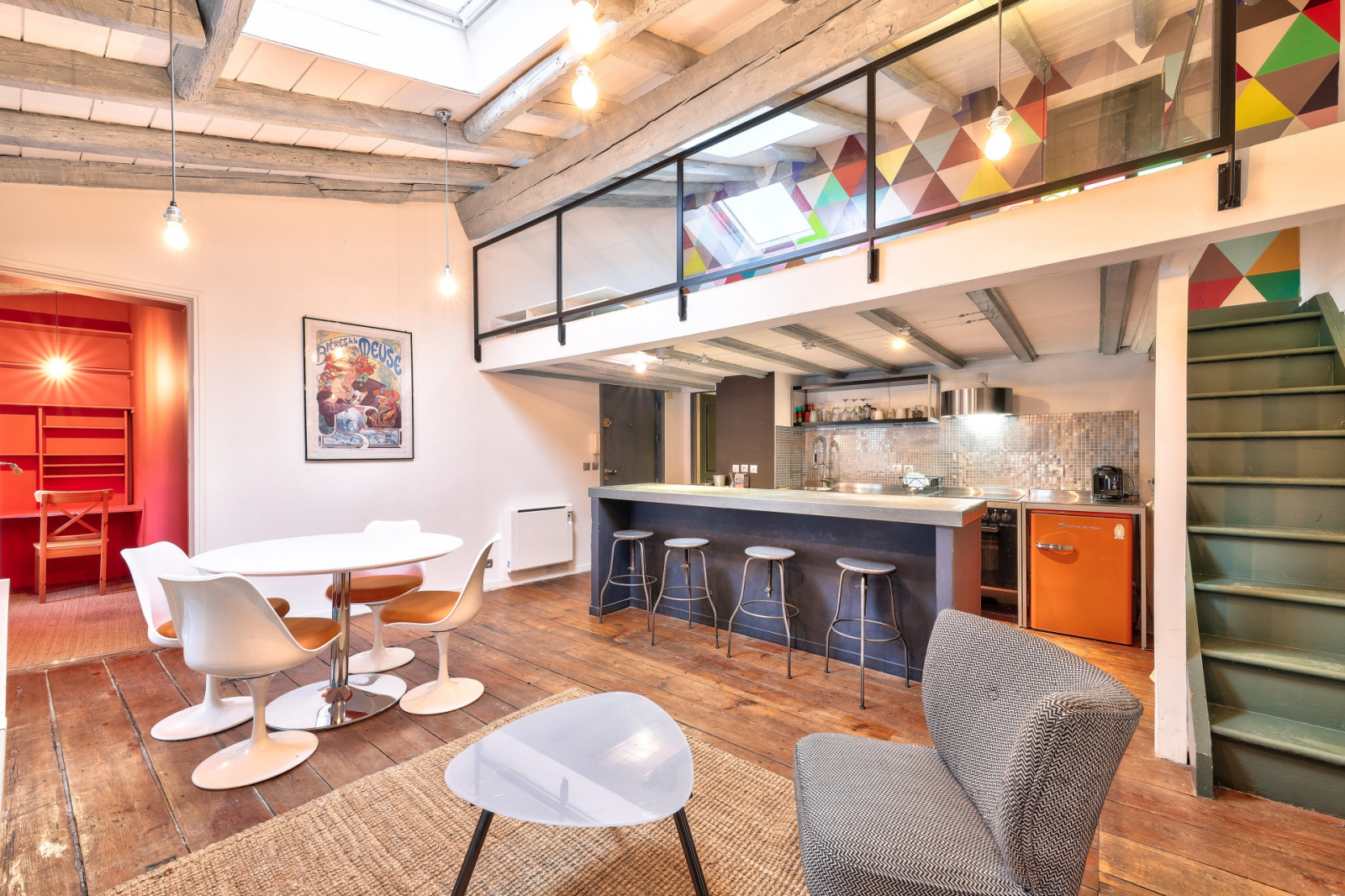 Grande pièce de vie conviviale avec cuisine équipée et espace complémentaire en mezzanine
