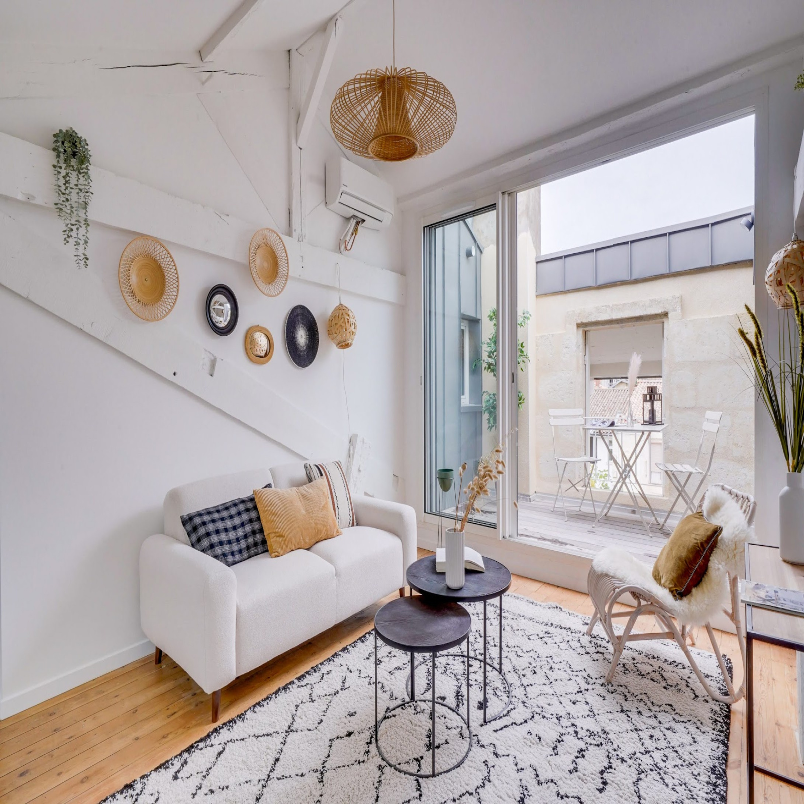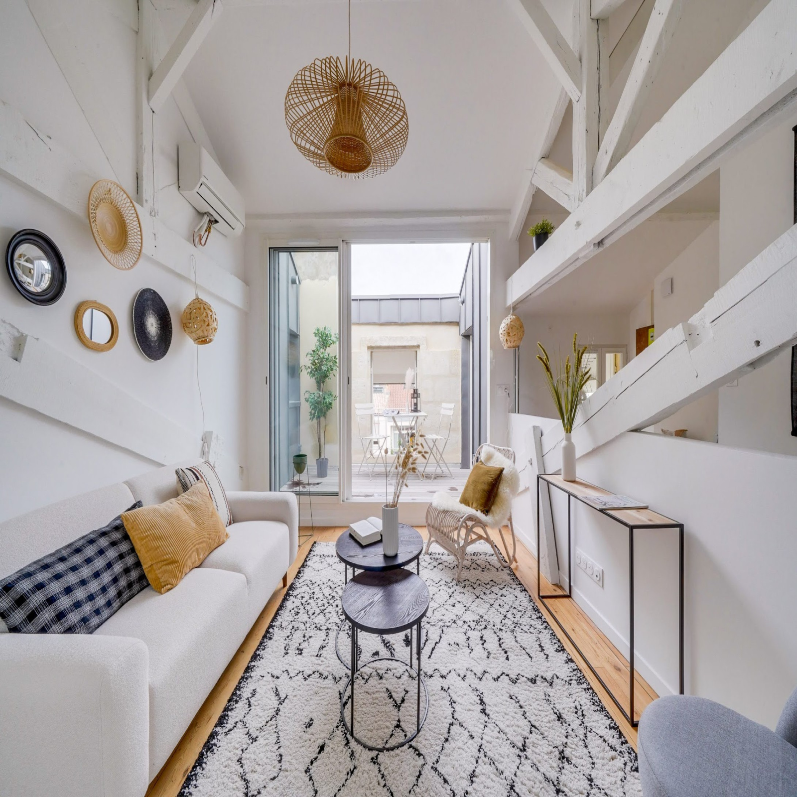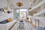 Grande pièce de vie lumineuse avec espace cuisine donnant sur une terrasse tropezienne sans vis-à-vis de 5m2 avec vue jardin.
