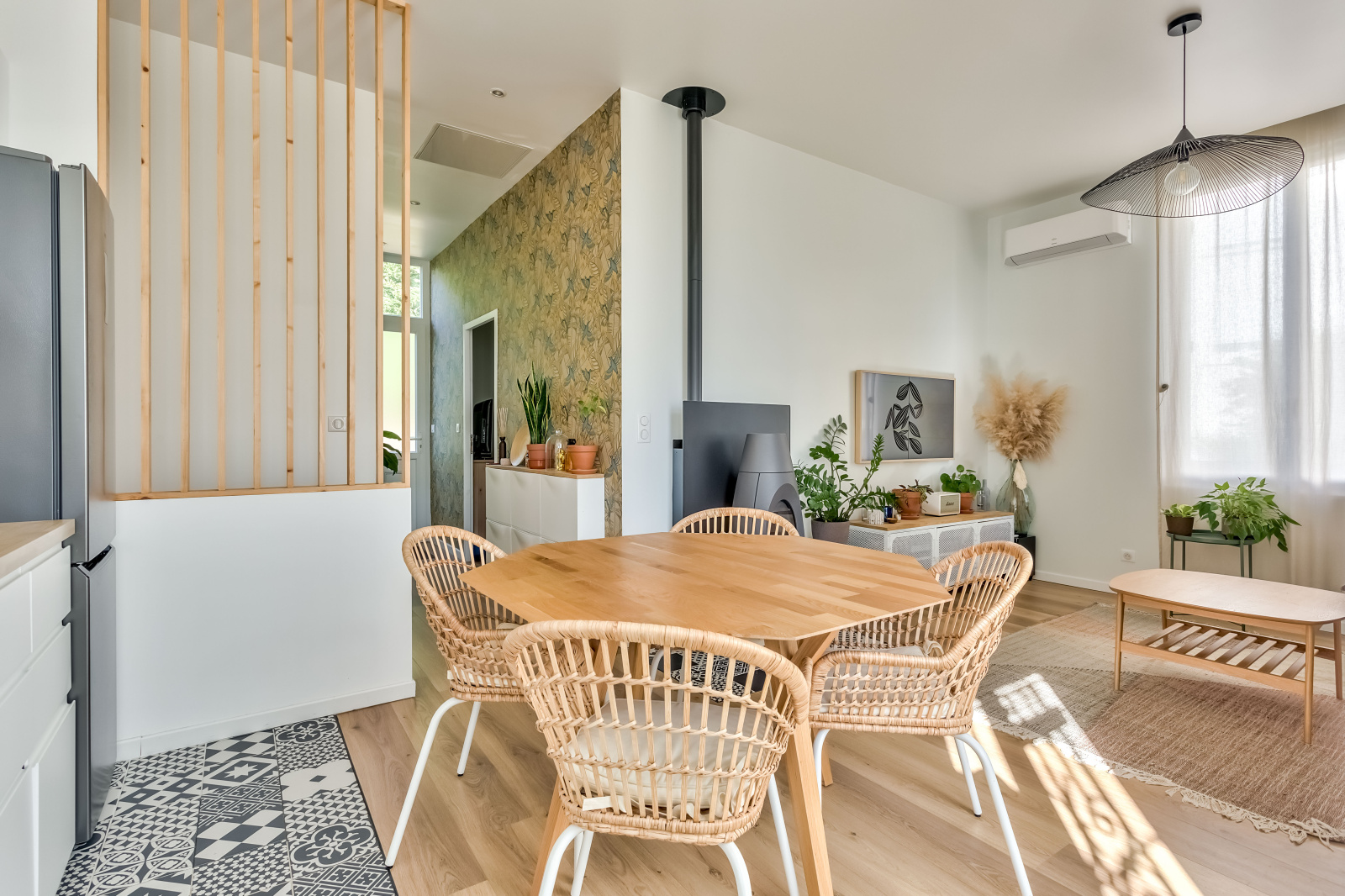 Cette maison en parfait état de 60m2 habitables se compose d'une entrée, d'un grand espace de vie avec cuisine ouverte et poêle à bois, de deux chambres, d'une salle de bains / buanderie.