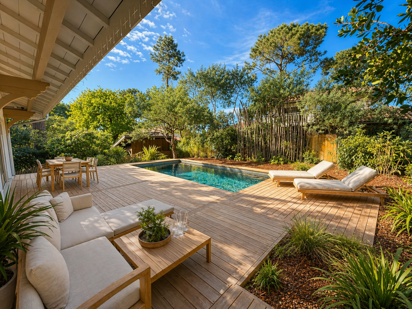 À l’extérieur, l’accès à la parcelle se fait par le sud. Le terrain, agrémenté d’une végétation locale, offre un cadre naturel et apaisant. Les terrasses prolongent agréablement les espaces de vie et permettent de profiter pleinement de l’environnement calme. Une piscine chauffée complète les prestations de cette villa idéale pour savourer l’art de vivre arcachonnais.